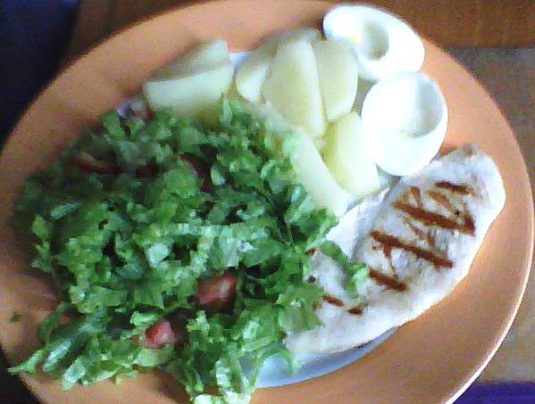 Almoço – peixe ou frango grelhado, legumes de todos os tipos, salada à vontade. Costumo intercalar  acompanhamento do prato: um dia com batata doce e no outro dia omelete de clara de ovo ou apenas a clara cozida.