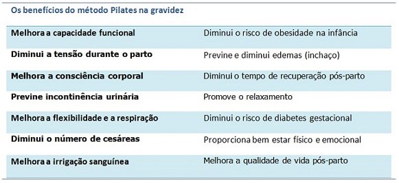Alterações na gravidez aumentam a demanda muscular e articular. O centro da gravidade (CG) é deslocado anteriormente, acentuando a curvatura da coluna lombar – hiperlordose lombar. Estima-se que 50% a 70% das gestantes são acometidas por dor nas costas, e o método Pilates surge para prevenir e diminuir a dor, fortalecendo e alongando músculos profundos ou estabilizadores. Os exercícios podem ser feitos tanto no solo (Mat) quanto nos aparelhos.